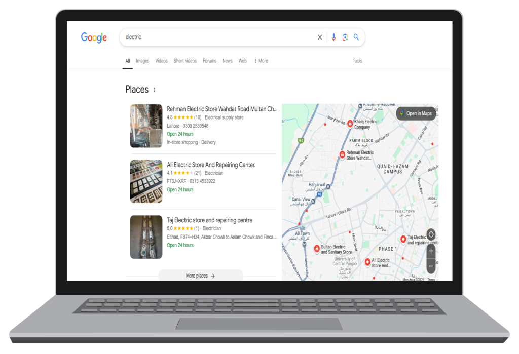 We require an image of a laptop to the right for desktop and underneath for mobile. The laptop must have the image inside it showing a local search and the businesses showing with a map next to them. Don’t copy the exact image, but create one similar.
